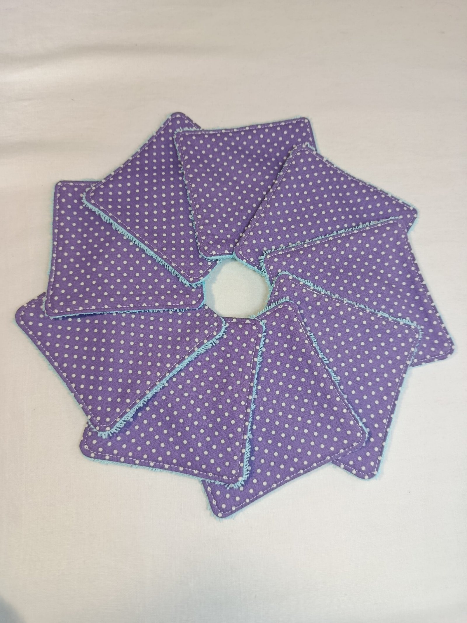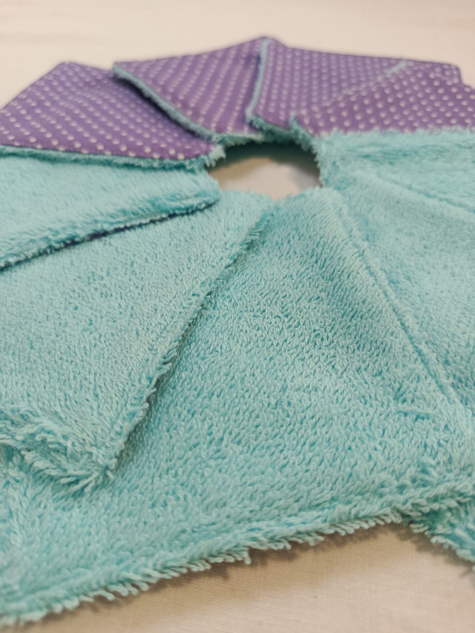 Côté pile, en coton. Côté face, en éponge. Je les ai fabriqué elles aussi dans un esprit soucieux pour l’environnement. Non seulement avec du tissu de récupération, mais également en respect pour la planète pour arrêter de jeter ses disques de coton jetables.