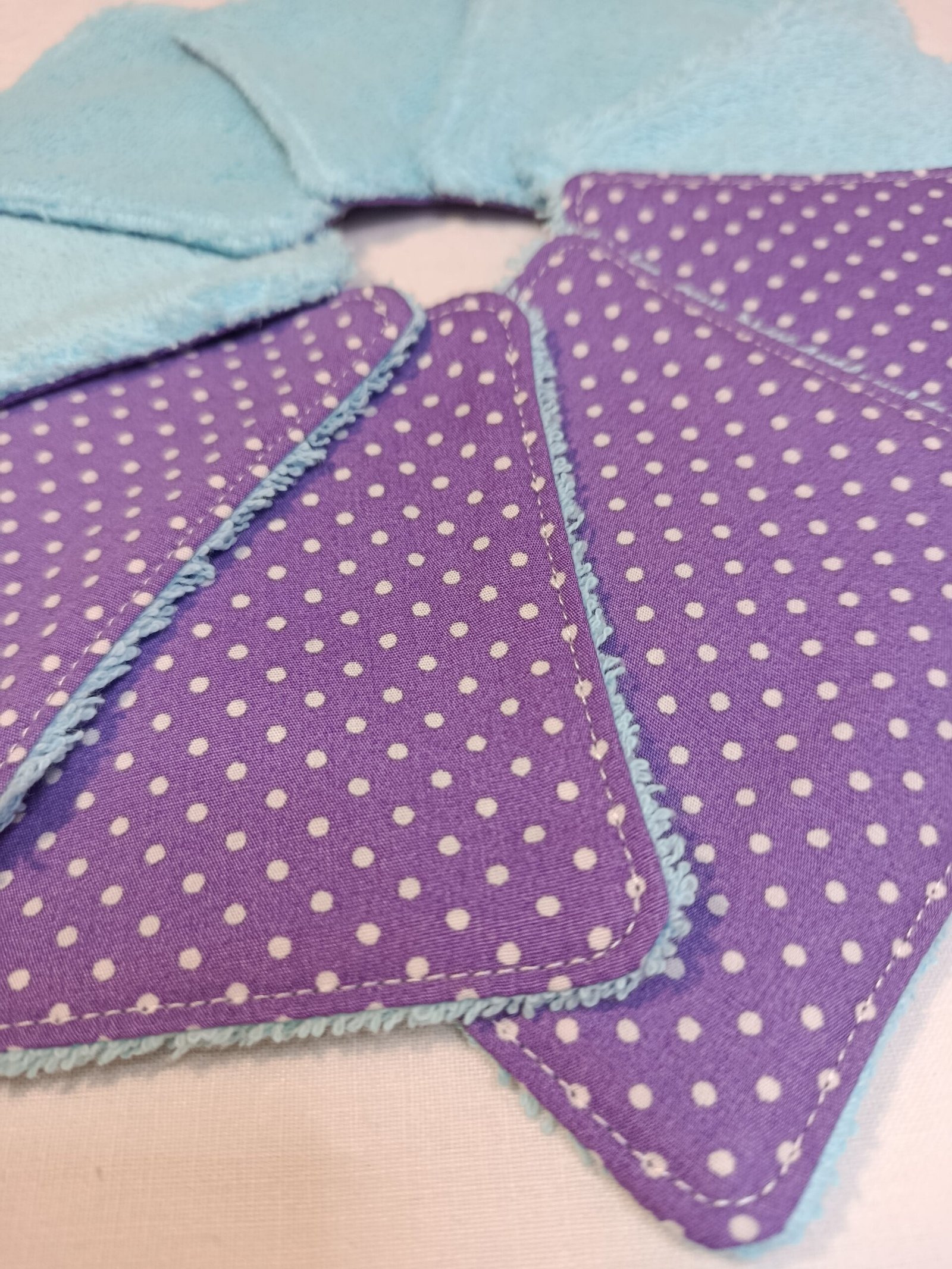 Le lot de 9 lingettes de 10×10 cm, dans une association de couleurs joyeuses, violet et bleu. Existe en micro collection (seulement 2 exemplaires).
