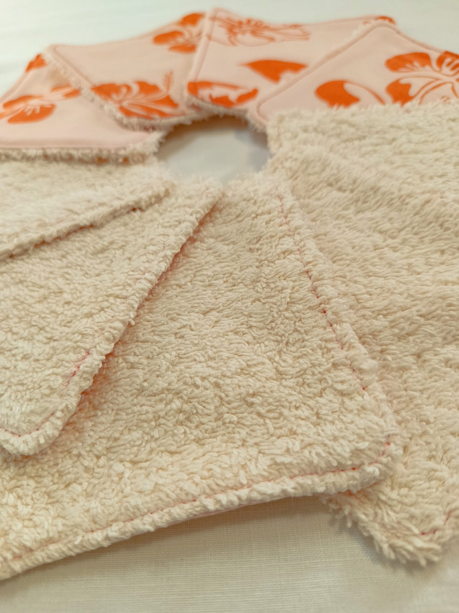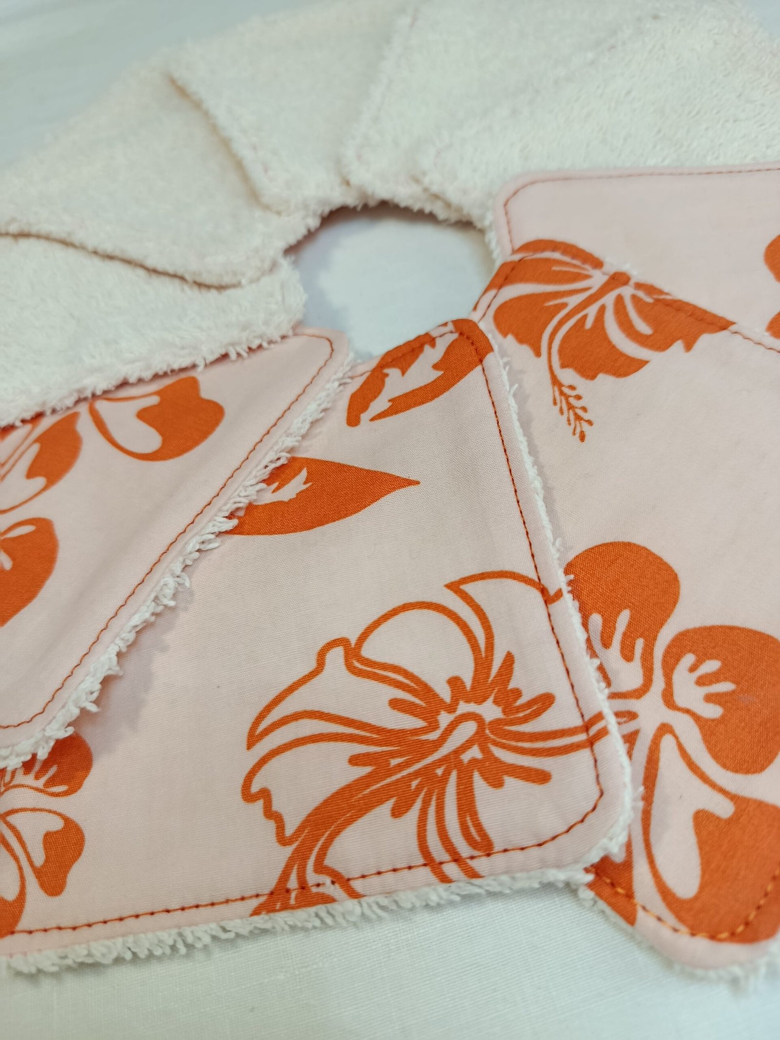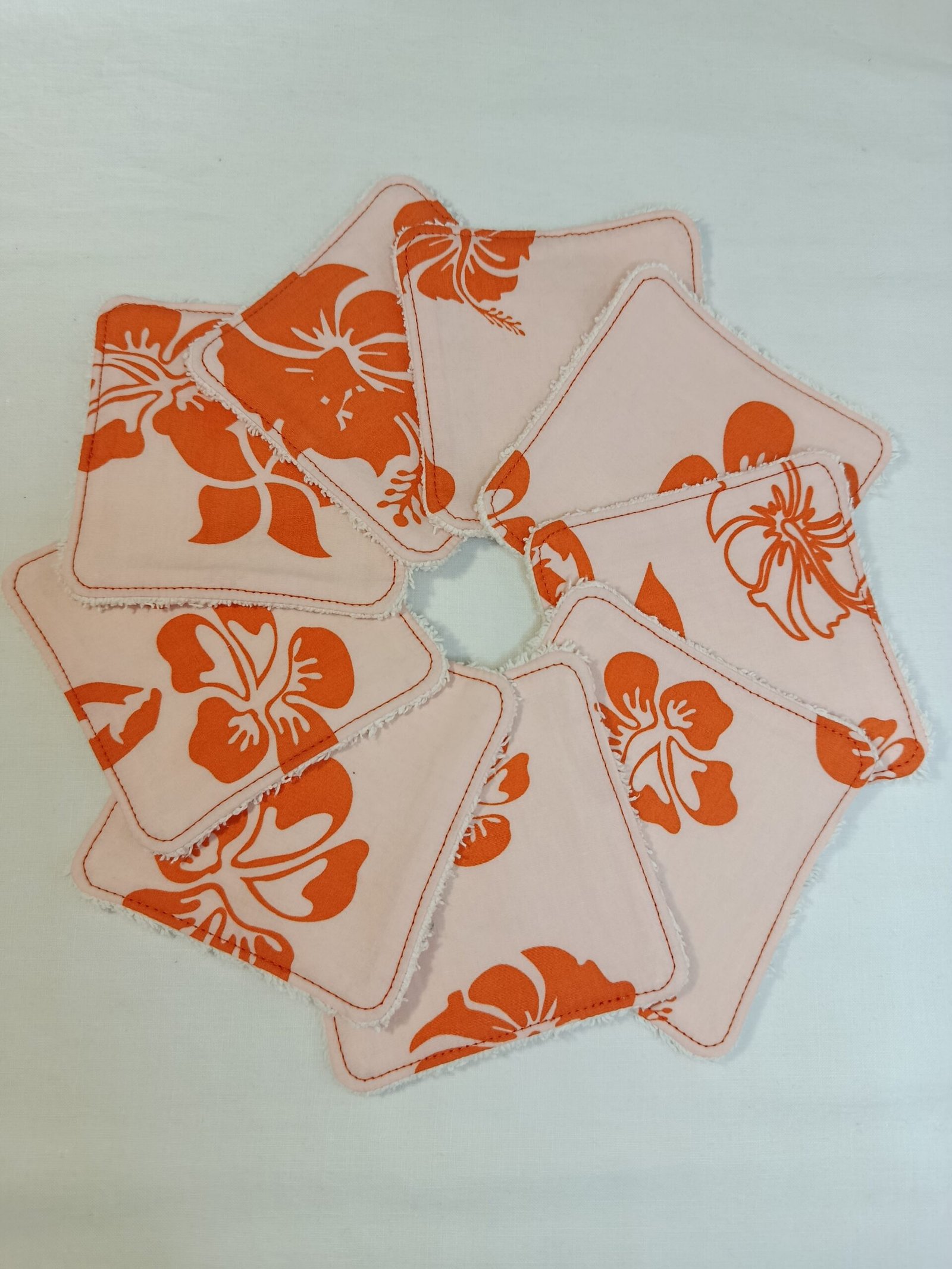 Le lot de 9 lingettes 10×10 cm, aux fleurs style hawaïennes oranges sur un fond de couleur saumon pastel, qui reflètent la douceur…