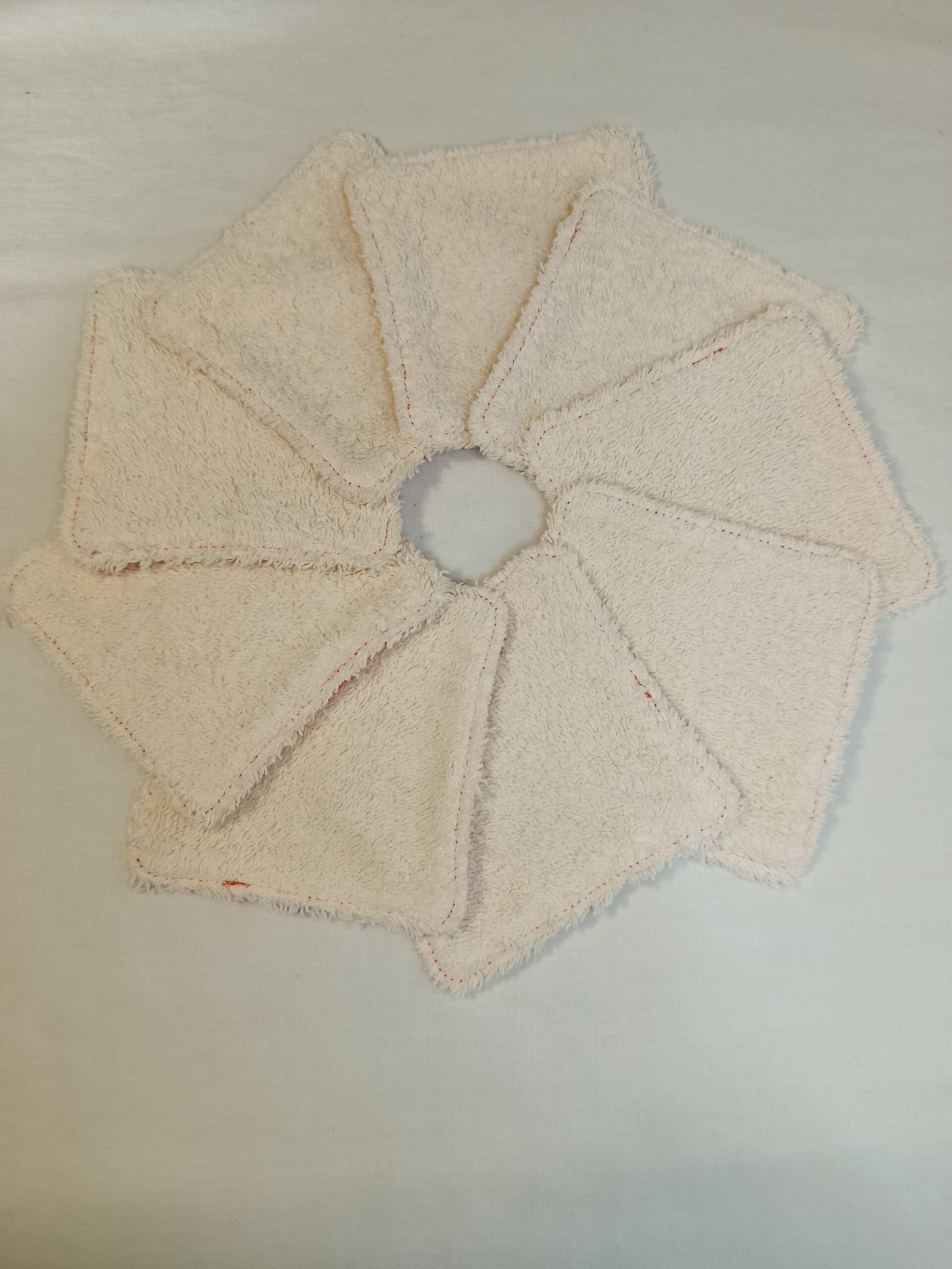 Côté pile, en coton. Côté face, en éponge. Je les ai fabriqué elles aussi dans un esprit soucieux pour l’environnement. Non seulement avec du tissu de récupération, mais également en respect pour la planète pour arrêter de jeter ses disques de coton jetables.