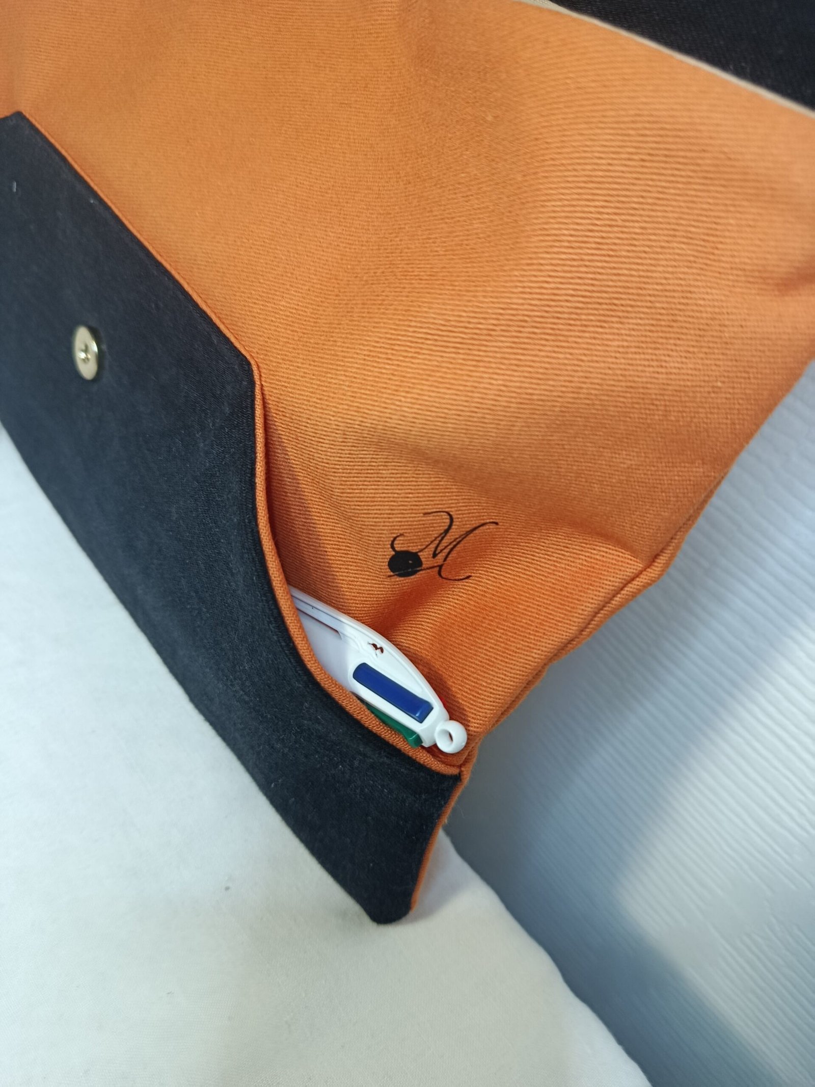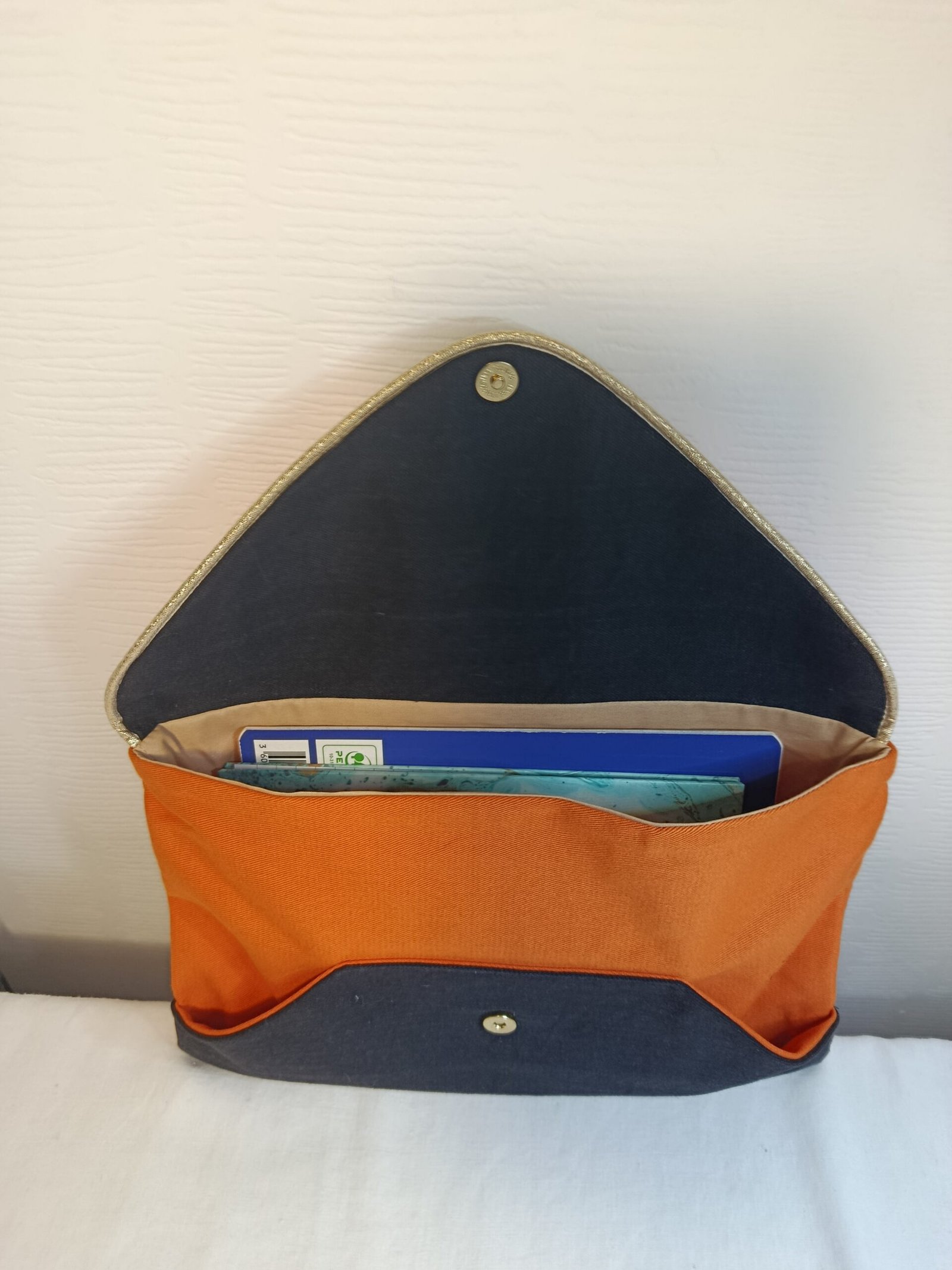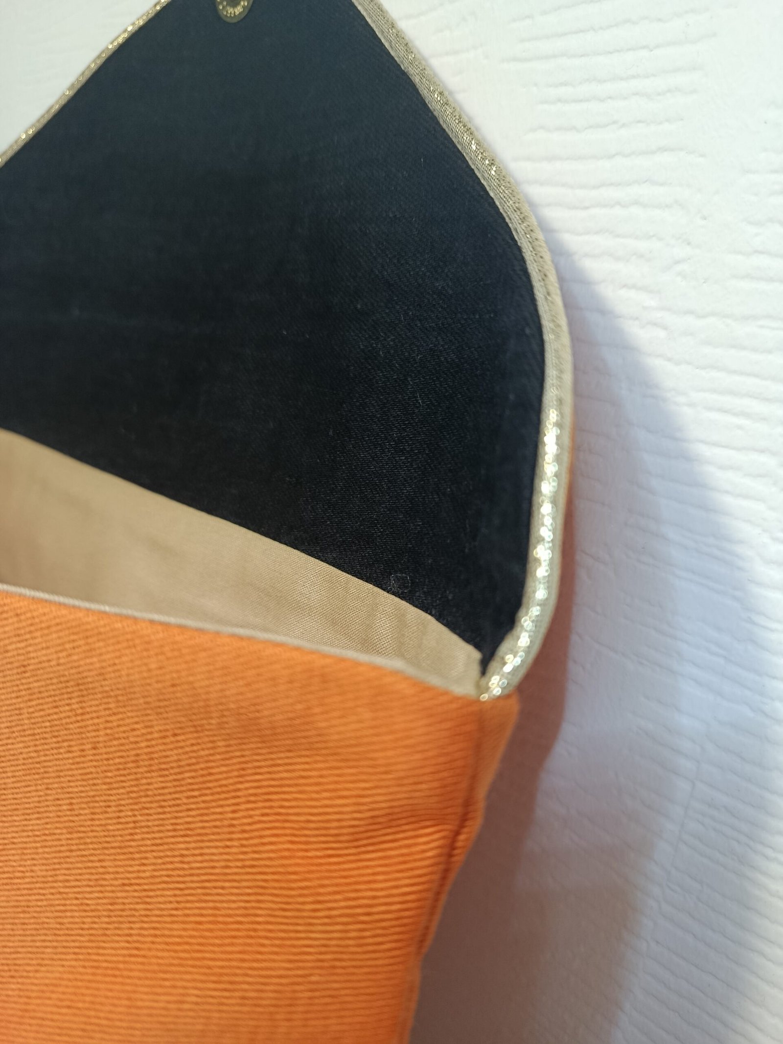 Réalisée en twill (noir) et un tissu en coton épais (orange) pour l’extérieur, bordé sur le rabas d’un passepoil doré. Et un tissu de qualité beige satiné pour l’intérieur. Et pour finir un petit bouton aimanté pour la fermeture.