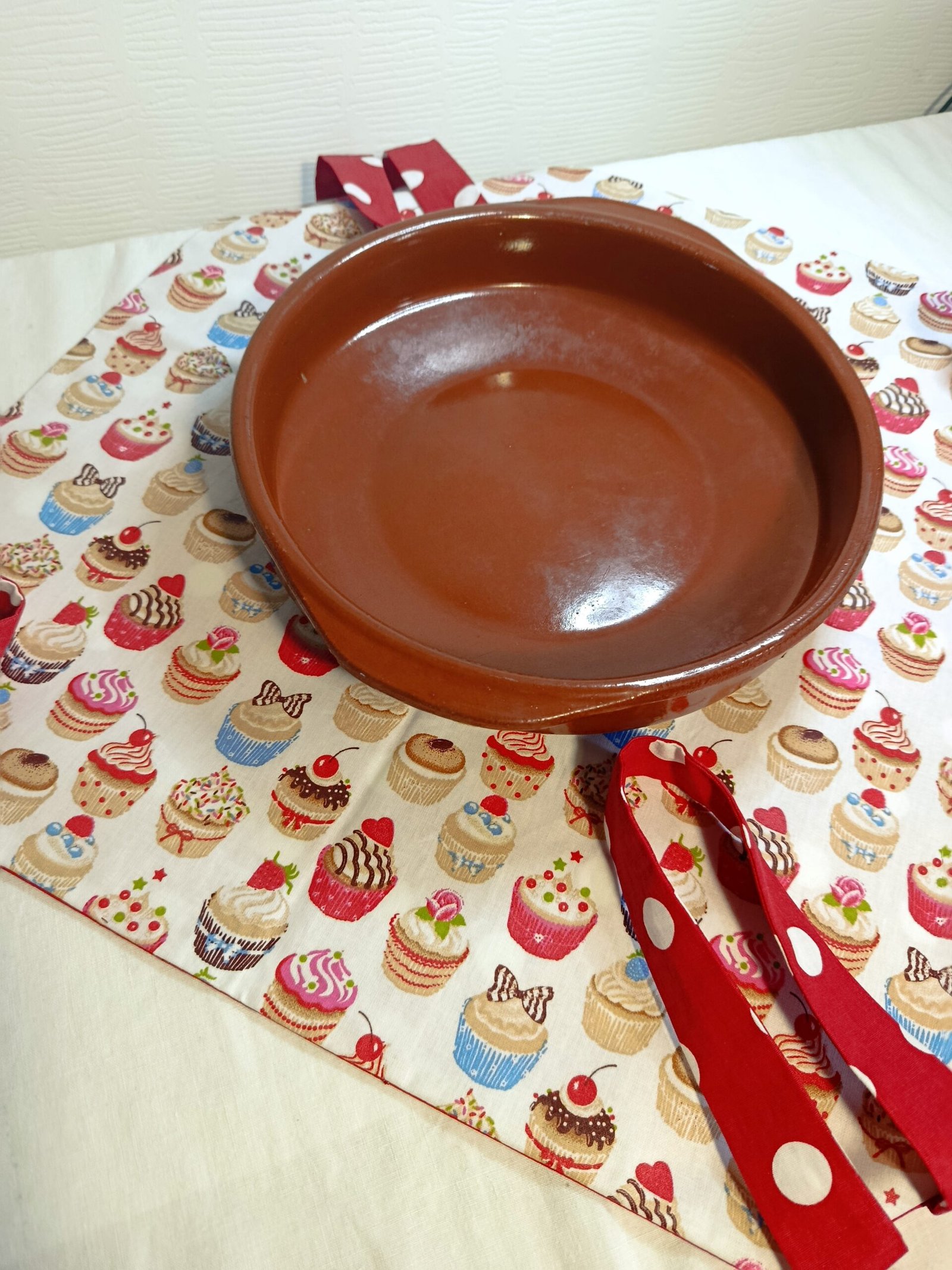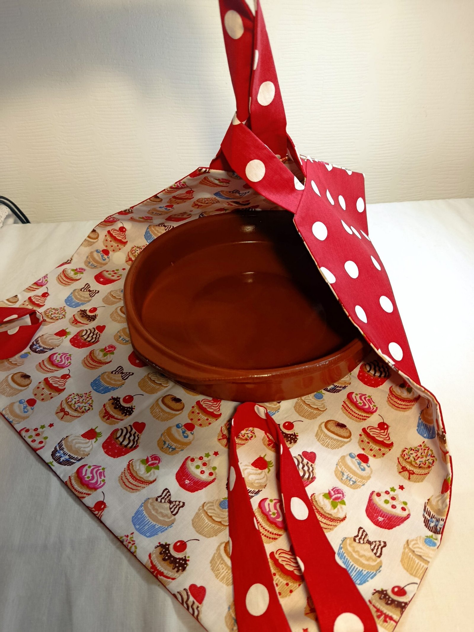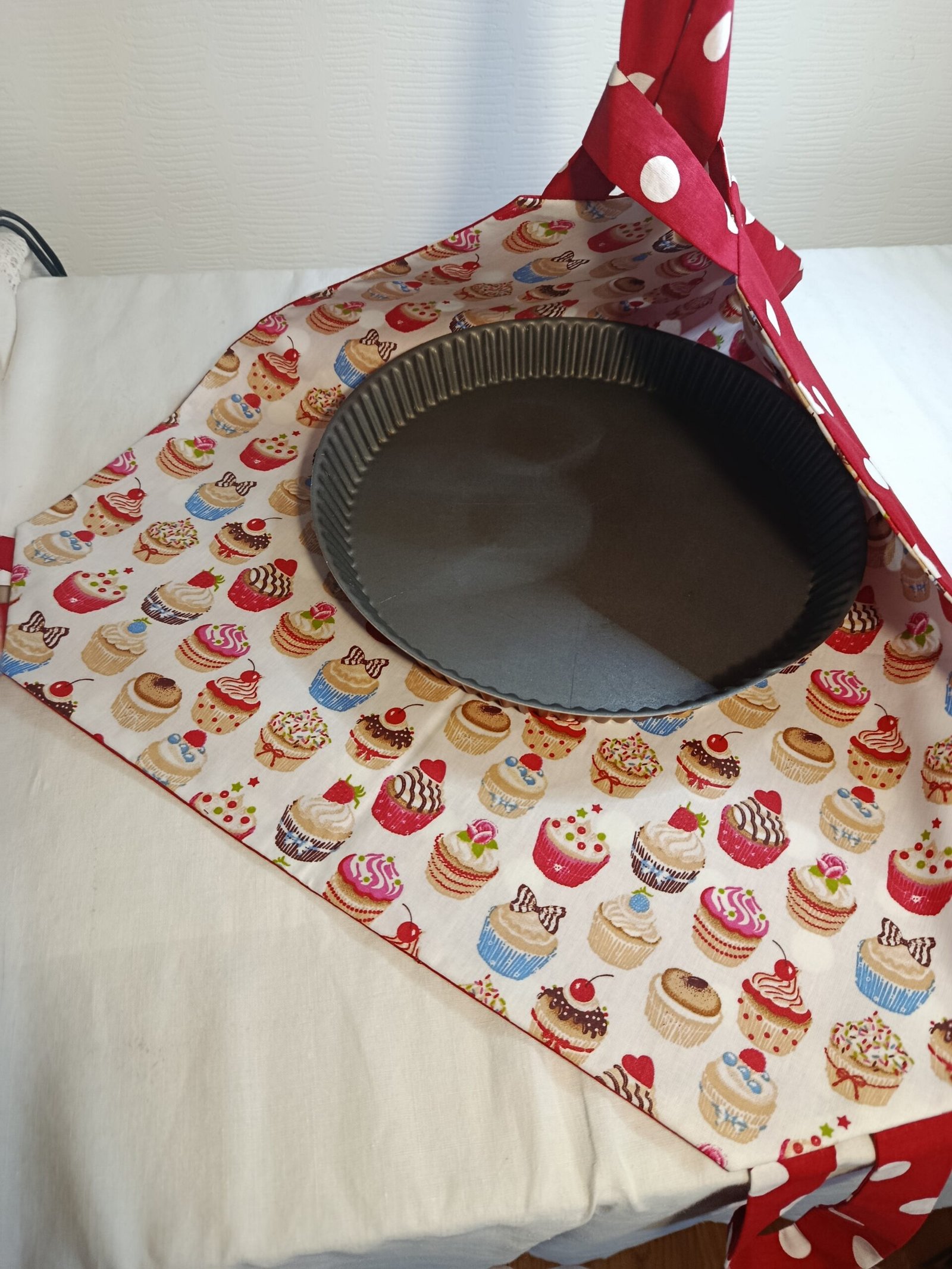 Le sac à tarte « Muffins » est conçu avec un tissu extérieur en coton et intérieur en récupération de nappe en toile cirée au motif « muffins ». Ce qui lui confère un entretien très pratique, juste avec un coup d’éponge, c’est nettoyé !
