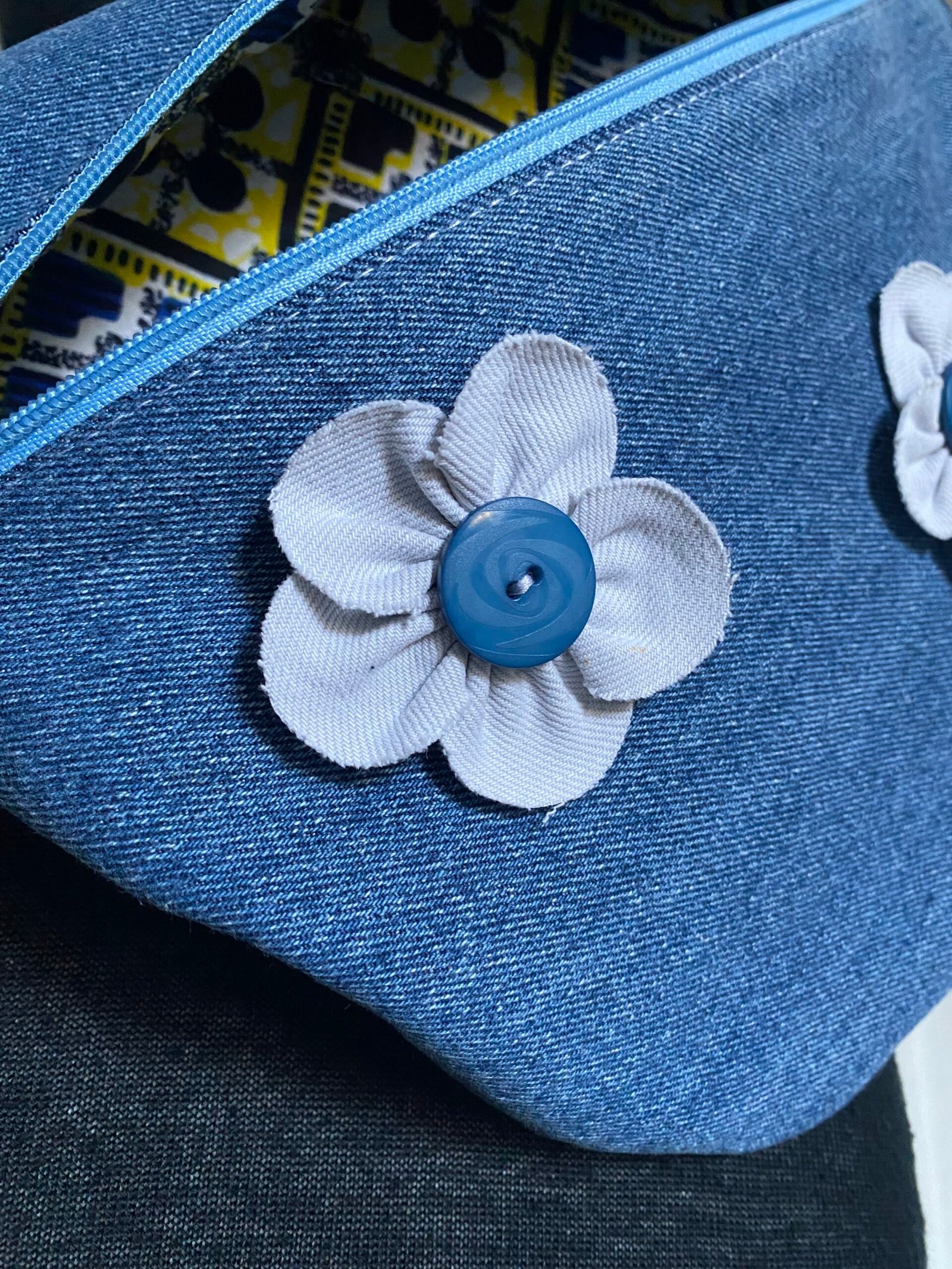 Conçu grâce à la récupération d’un jean, décoré de petites fleurs et boutons recyclés. Il est doté d’une doublure intérieure en coton aux motifs ethnique.