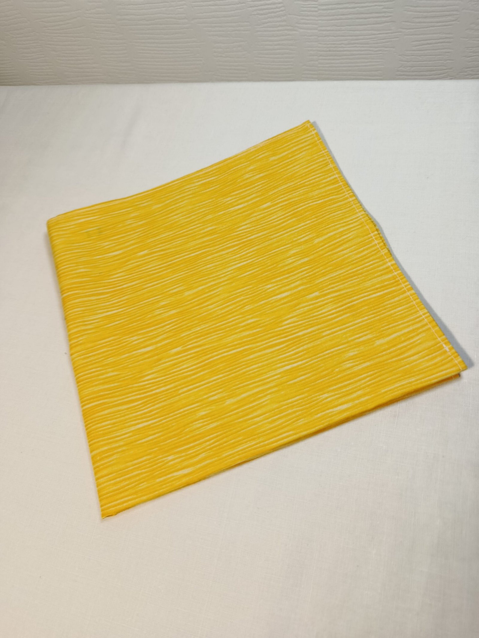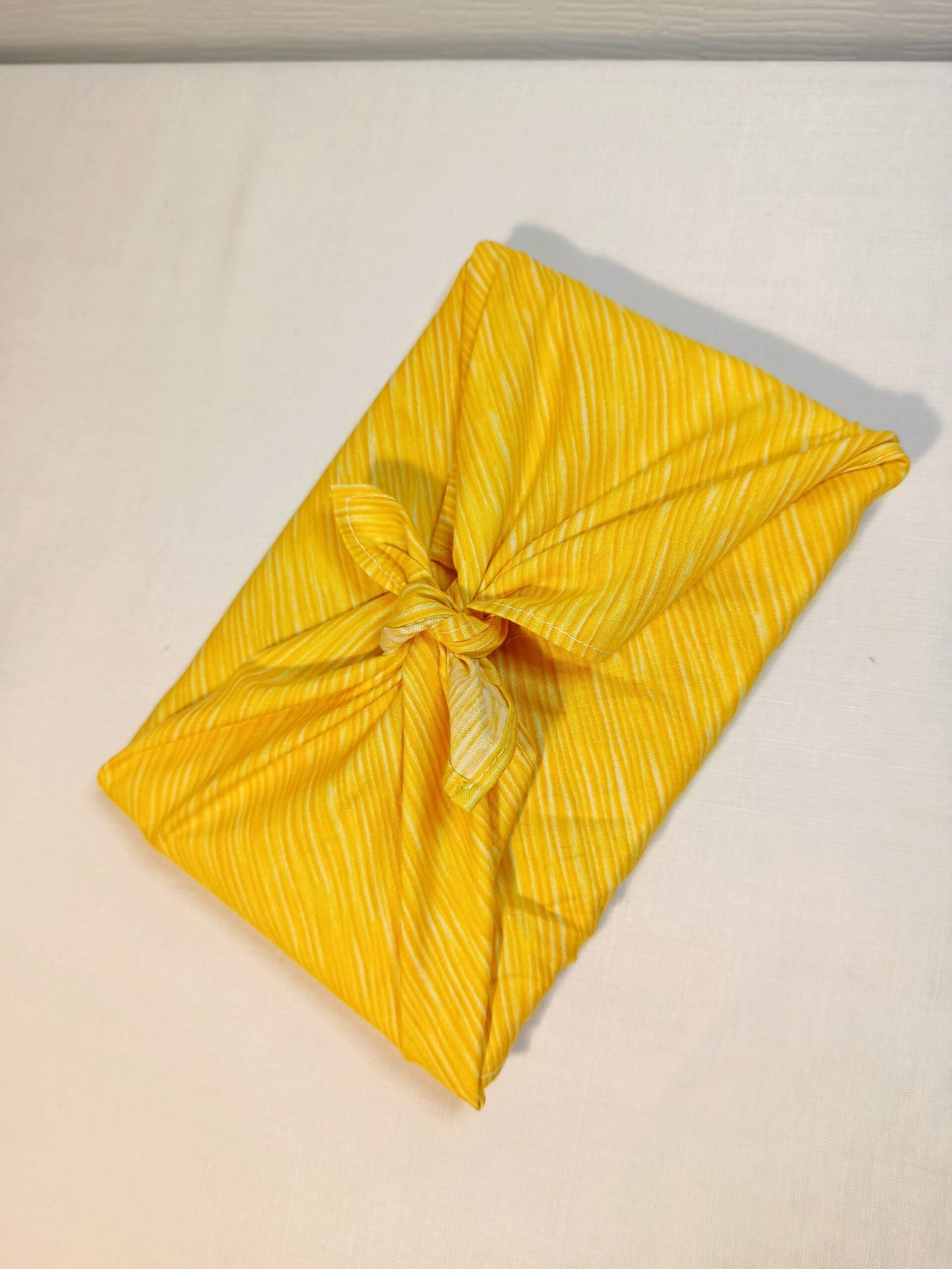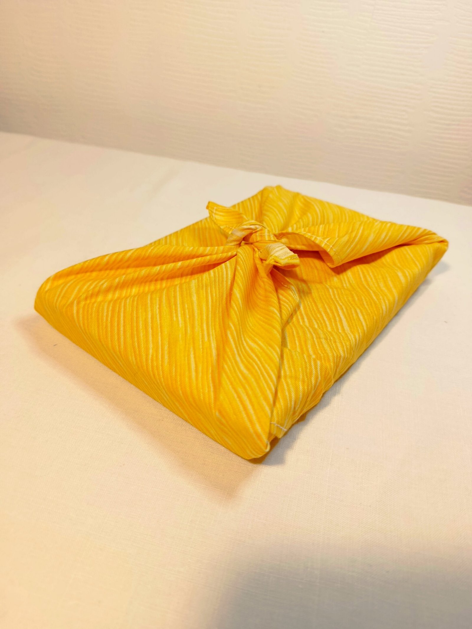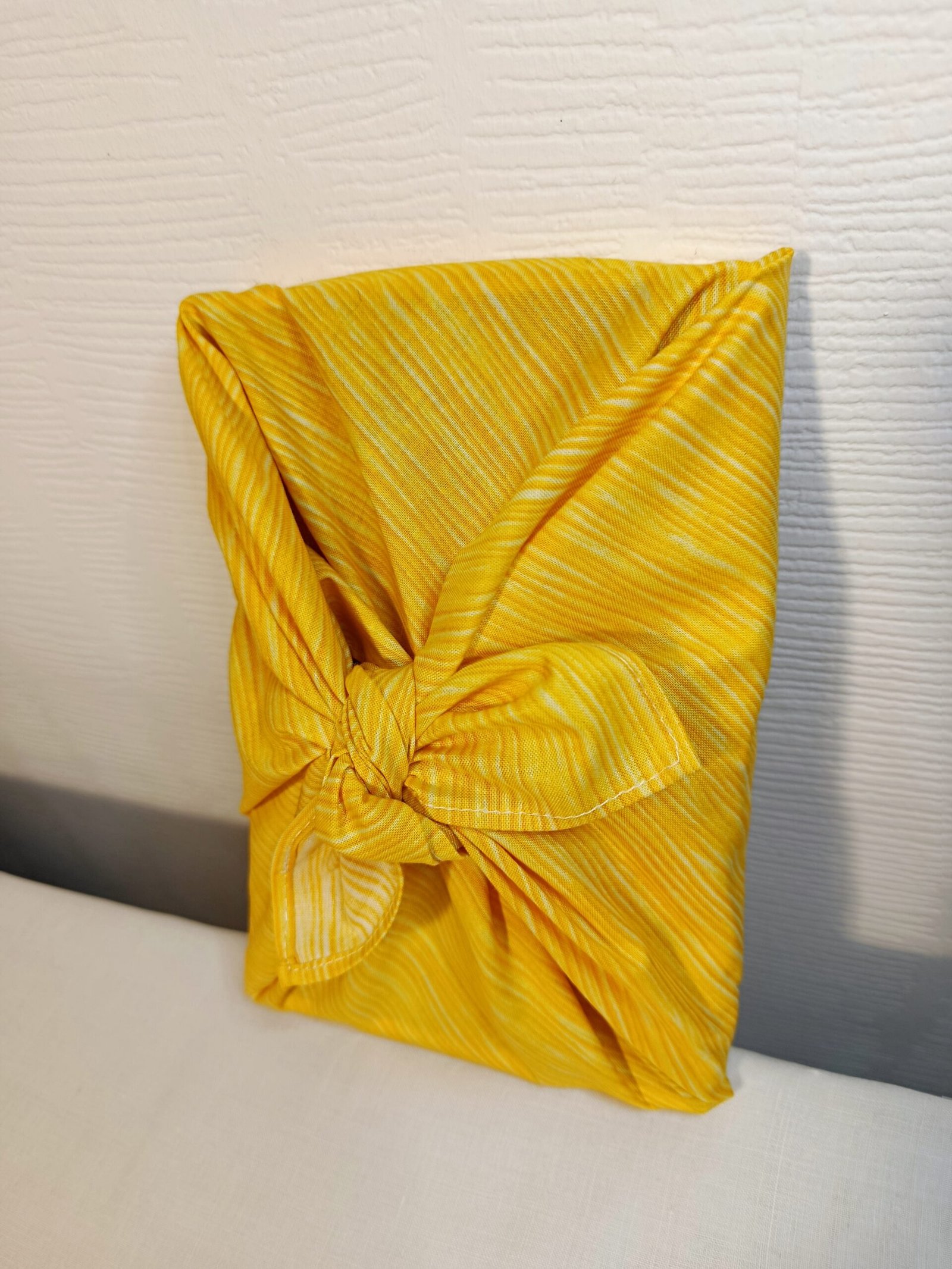 Ce furoshiki a été créé avec un tissu (upccylé) en coton couleur jaune et aux rayures délicates, soigneusement choisi. Et mesure 50 x 50 cm.