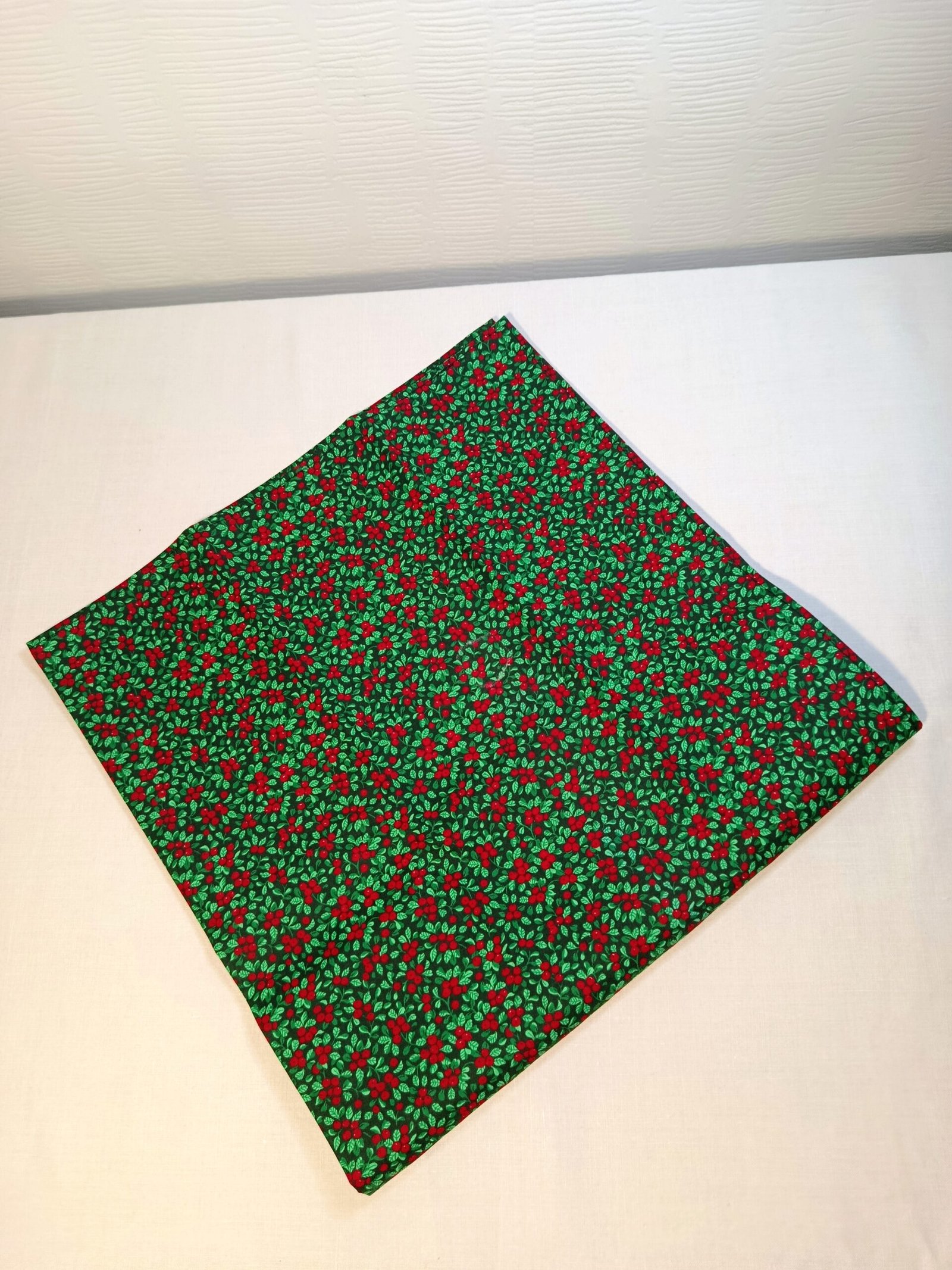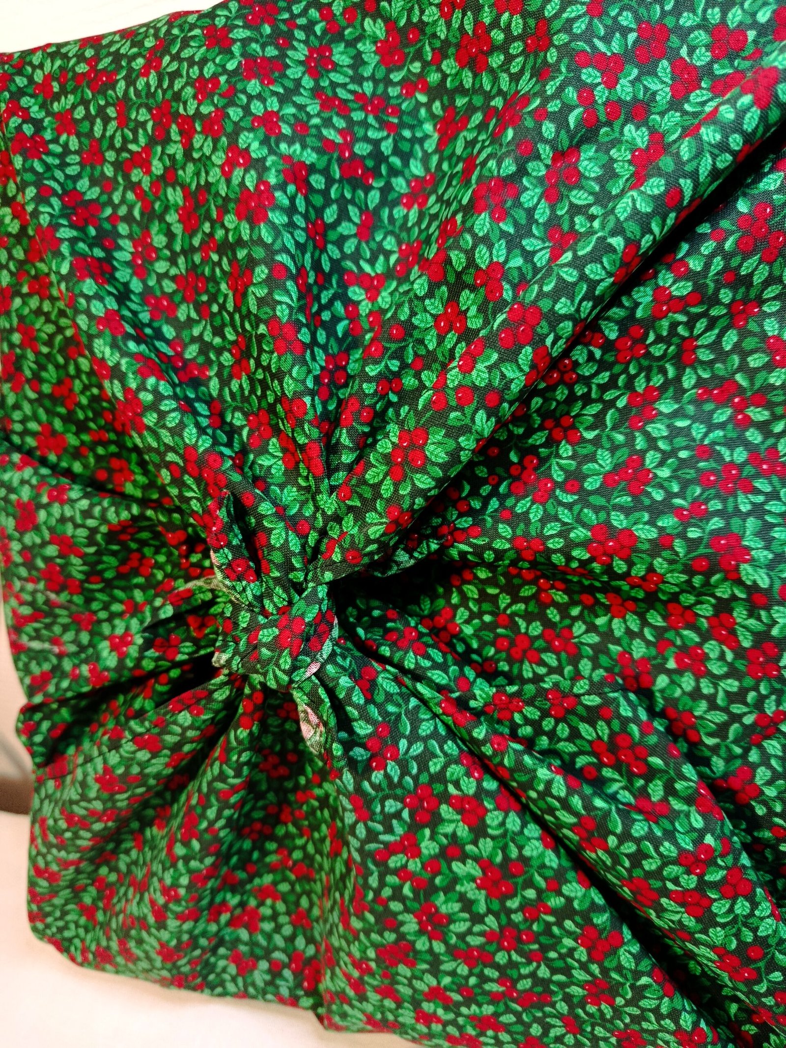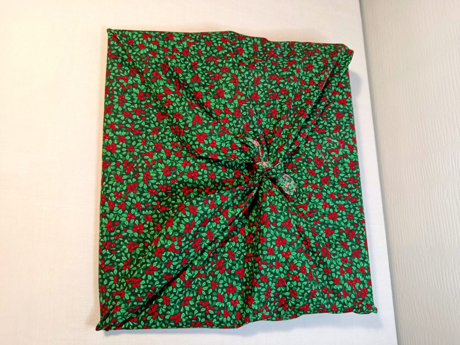 Ce furoshiki a été créé avec un tissu (upccylé) en coton de qualité et soigneusement choisi, décoré de pyracanthas. Et mesure 70 x 70 cm.